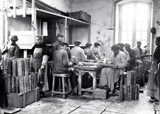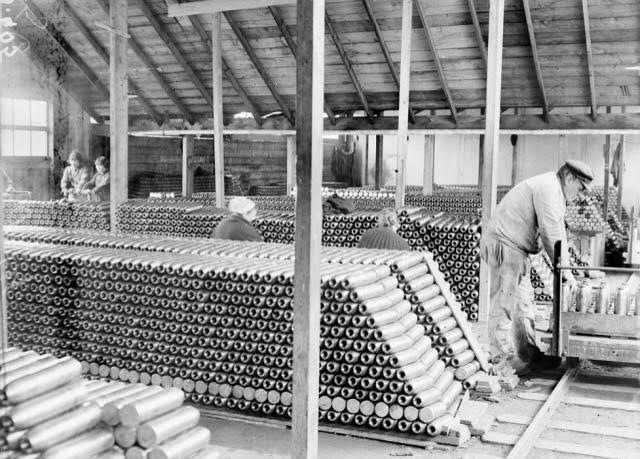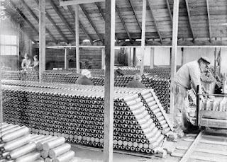 I sometimes write that WW1 was a war that straddled eras. The below picture captures it. The automation we envision with manufacturing modern weapons was partly there but partly not yet arrived. The photo below shows individuals hammering shells back into shape to be reused.